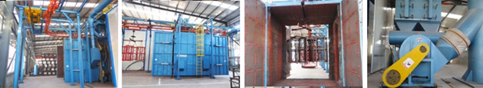 该系列产品采用多工位定点旋转抛射清理的方式将铸件表面的粘砂、氧化皮去除,使铸件重现金属本色。主要用于机车的摇枕、侧架、车钩及钩尾框等车辆件,同时也可清理近形尺寸的铸件和批量小件。 设备展示图: