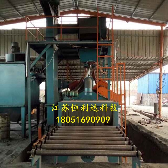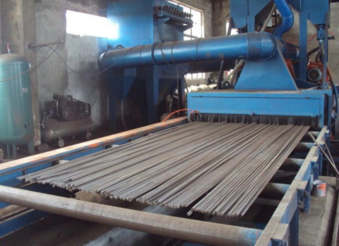 连续式直通钢筋抛丸机常见的有1根、5根、l5根、l8根,最多40根。为了保证清除铁皮的效果,一般配置4~6个抛射装置,这些抛丸轮配置在线材的上部或下部,可纵向抛射,也可横向喷射,抛出的丸粒扇面要覆盖线材通过的整个宽度。