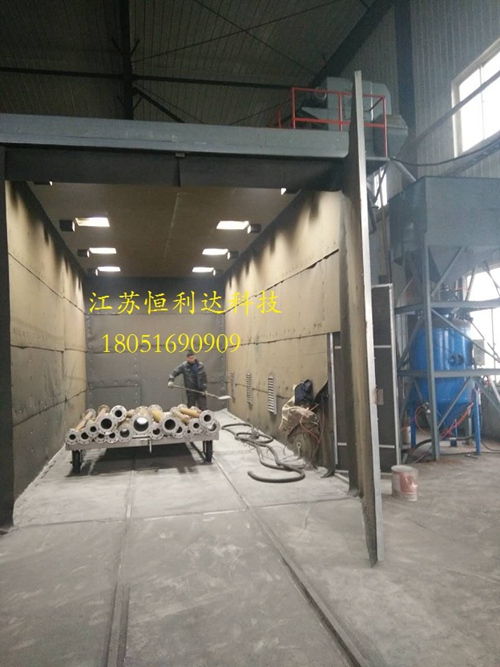 喷砂房由房体、电动卷帘大门、满幕帘分选器、全室除尘器、烟筒、风机、集尘装置、喷砂主机、斗式提升机、横向螺旋输送机、输送系统、地坑钢构、电控系统、照明系统、空调式喷砂服、固定工作平台等几部分组成;
